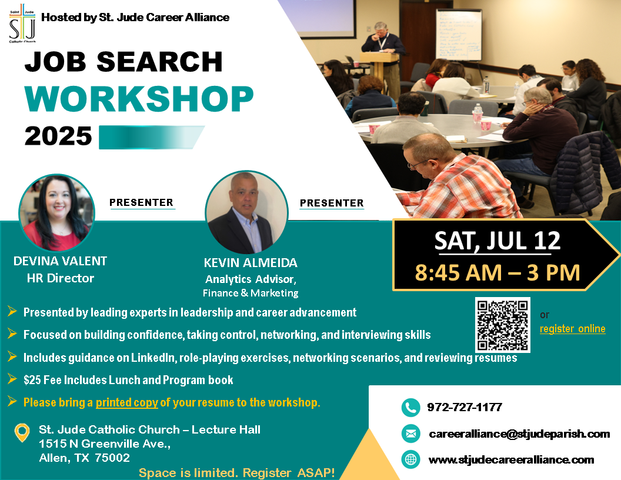 The July 12 comprehensive job search workshop will take place in the Lecture Hall on the St. Jude parish campus. Participants should park in the northeast parking lot on Greenville Avenue, enter through the church office doors, and follow the signs inside to the Lecture Hall location. This event is open to all job seekers, regardless of faith, ethnicity, or age.
