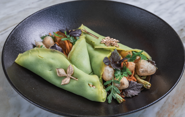Guests may begin their dinner with vegetarian spring hand rolls, fresh Bloomsdale spinach crepes filled with locally grown mushrooms from Texas Fungus, spring potatoes, heirloom lettuce and a delicate peanut sauce or a spring tomatoburrata with smoked peach, chamomile tomato tea, and basil.